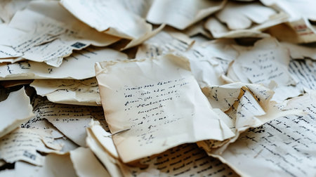 An abstract background featuring a pile of handwritten essays, their pages filled with ideas and arguments