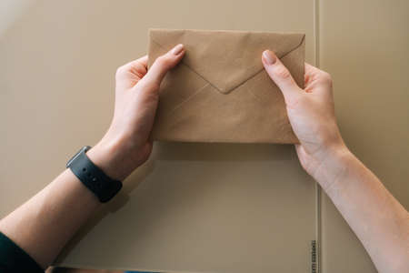 Close-up high-angle view of unrecognizable young woman holding in hands envelope with received letter sitting at table. Lady putting handwritten letter into envelope and closes it, selective focus.