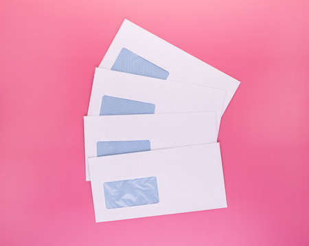 Blank envelopes with address window isolated on pink background. White paper envelopes mockup for business correspondence, postal stationery and corporate lettering