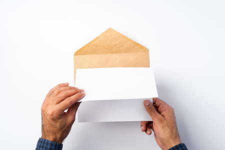 Top view of male hands hold (open) an envelope above white background