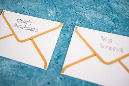 small business vs big brand texts over newsletter email envelopes, concept of customer behaviour and supporting small local businesses