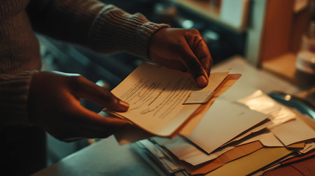 Close up of a woman's hand holding a letter in a cafe
