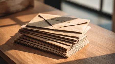 stack of kraft paper document envelopes neatly arranged on a wooden desk, warm natural light creating soft shadows, minimal modern office mood