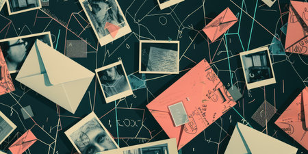 A bunch of open letters with photos and other documents on a textured dark blue background. AIG51A.