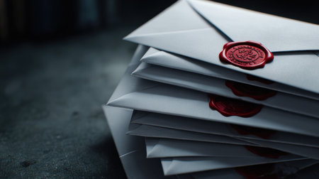 A stack of envelopes with red wax seals on them. The envelopes are white and stacked on top of each other