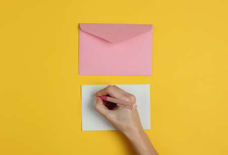 Female hand writes a letter with a pen on yellow background. Wedding invitations, love letter, valentine. Top view