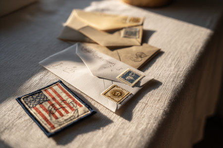 Vintage Envelopes and American Flag Patch on Sunlit Desk