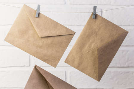 Postage communication background, new paper brown craft letter envelopes hang on clothespins on a rope against a white wall background.