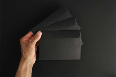 white caucasian male hand holding three blank black envelopes on black background, mockup with copy space