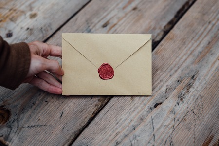 Man hand holding wax seal envelope on wooden background