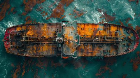 A rusty ship floating in the vast ocean waters from an aerial perspective