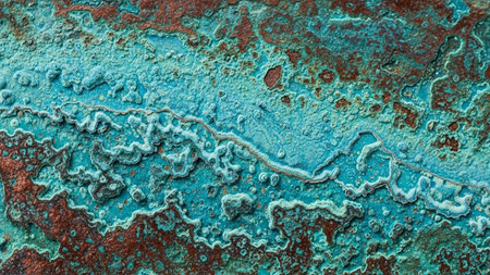 Close up of a rusted metal surface with a teal patina and textured corrosion. Clear details and vibrant colors...