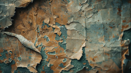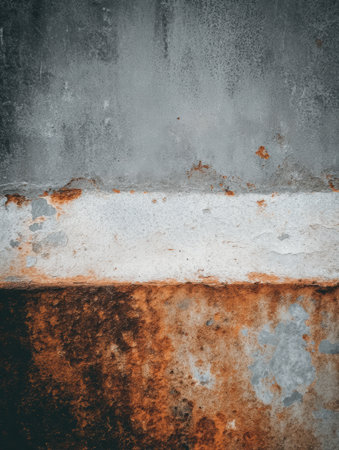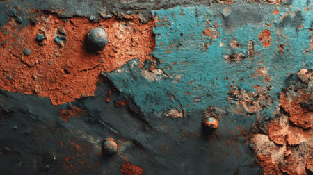 Weathered surface displays layers of rust and peeling paint, revealing a blend of textures in an urban environment, showing industrial decay and age.