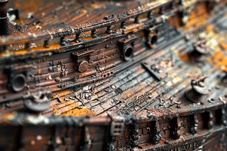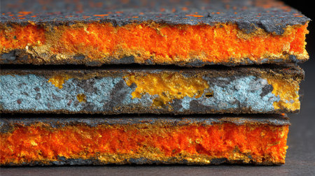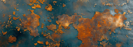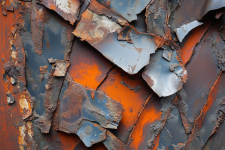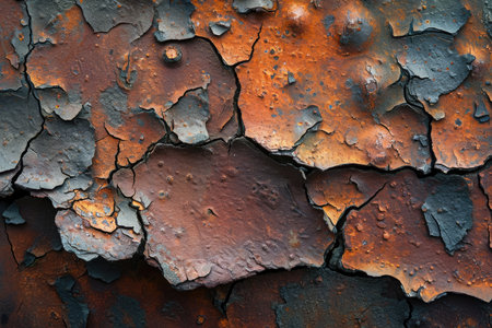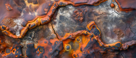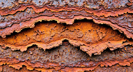 A closeup view of a distressed metal surface that showcases vivid rust formations and unique texture details. Generative AI