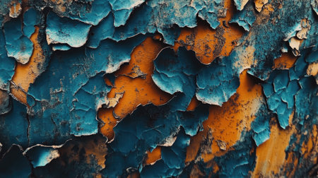 Explore a vibrant close-up of a weathered surface showcasing peeling paint in stunning blue and orange hues, ideal for artistic and abstract projects.