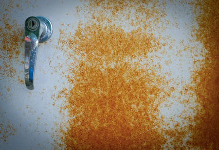 Close of abandoned car door with chrome handle, paint peeling, old colors, rough, eroding rust metal iron, vintage car. Selective focus.