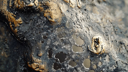 The surface of an aged rock formation reveals intricate textures, with dark veins, golden patches, and small cavities. Natural light highlights these unique features, showcasing Earth's history.