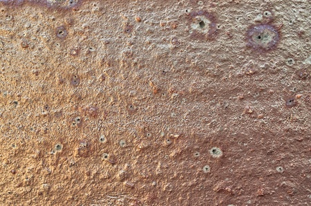 Corroding orange metal surface showing textured peeling paint and rivets