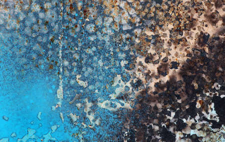 Corrosion. Vintage plate with weathered colors and rust. Spotted blue, brown and orange metal plate. Old oxidized colorful textured surface.