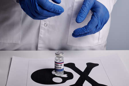 Doctor shows covid vaccine and death symbol - labs photo. Coronavirus vaccine bottle stay on skull sign printed on paper page. Medic hands in blue nitrile gloves over white desk surface.
