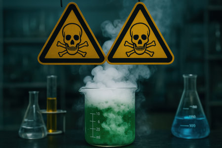 A lab beaker emits green fumes, with skull warnings indicating a toxic chemical reaction.