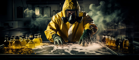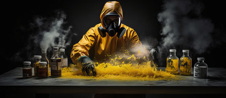 Man in yellow protective suit and respirator working in chemical laboratory.
