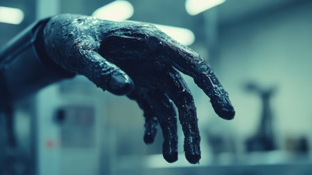 An intricate close-up view of a robotic hand showcasing a unique textured surface, highlighting advanced technology and innovation within a modern setting.