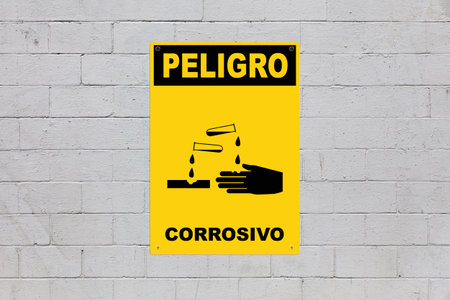 Yellow warning sign screwed to a brick wall to warn about a threat. In the middle of the panel, there is a gas mask symbol and the message in Spanish saying Peligro Corrosivo.