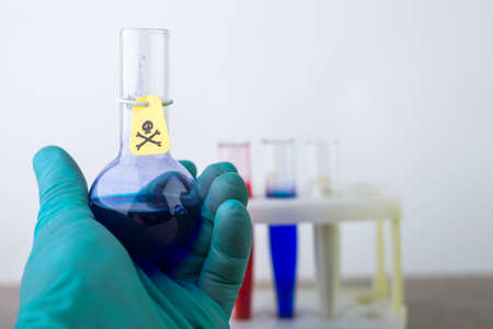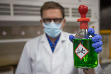 container with a poisonous substance in the scientist's hand, a yellow warning label with a skull and bones, a background of test tubes, a short focus