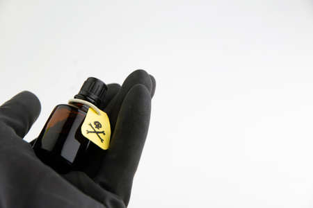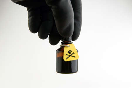 dark jar, etiquette with a warning sign about the content of poisonous substances, in the hand of a medic