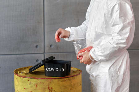 a man in a protective suit puts pieces of meat in container, coronovirus