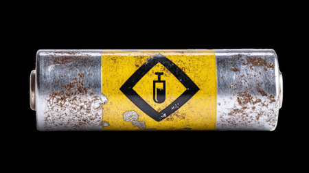 Corroded battery showing liquid chemical hazard symbol on transparent background