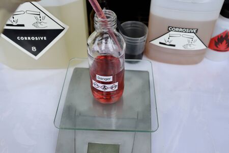 Glass flasks with poisonous water. Production of hazardous liquids for the environment.