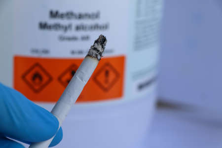 Hand holding cigarettes near flammable objects