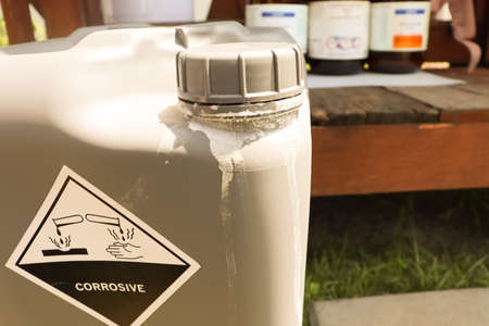 A metal bucket is labeled with a corrosive sign and text to indicate that the contents are hazardous and potentially harmful to handle.