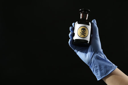 Woman in gloves holding glass bottle of poison with warning sign on black background, closeup. Space for text