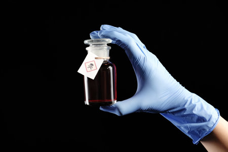 Woman in gloves holding glass bottle of poison with warning sign on black background, closeup