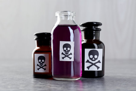 Bottles with warning sign on gray table