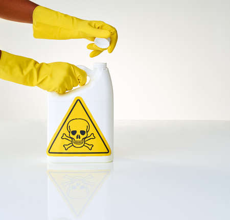 Caution - handle with care. Cropped shot of a person opening a bottle of toxic liquid against a grey background.