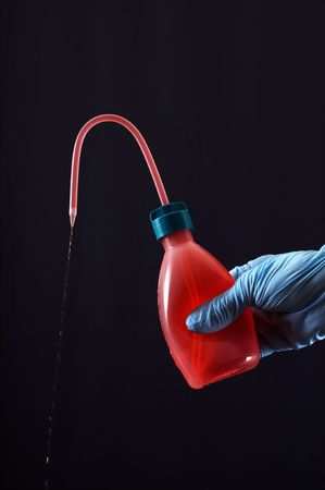 a vial of poison in the hand of a man with black gloves on a light background, overexposure, toning