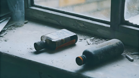 Abandoned bottles sit on a dusty windowsill, surrounded by debris, with soft light filtering through, evoking a sense of neglect and forgotten memories