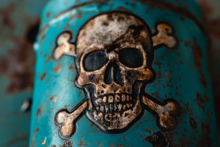 Closeup photo of a distressed skull and crossbones symbol painted on an aged, rusting toxic material surface
