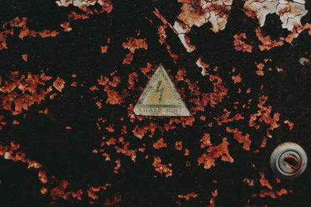 Vintage metal surface with high voltage warning sign and rust. This weathered metal surface displays a high voltage warning sign, with rust adding to its aged appearance.