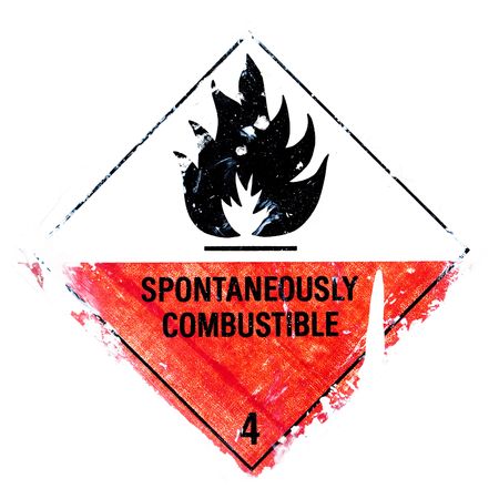 A grungy spontaneously combustible - warning isolated on white.