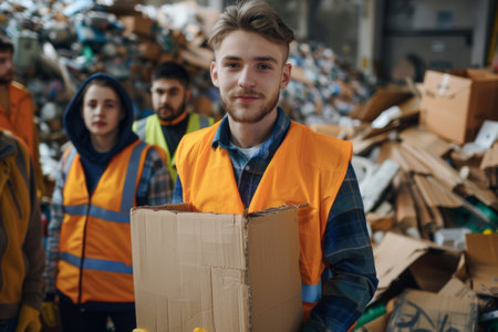 Side view of a worker at a recycling facility against a backdrop of sorted waste materials