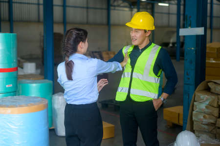 Diverse stockroom team working at customers orders, preparing packages for delivery in storage room. African american wearing industrial overall and helmet working at goods inventory