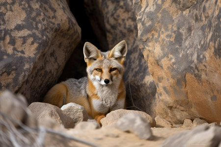 desert fox hiding among the rocks, watching its prey nearby, created with generative ai