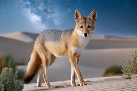 Desert fox looking at the viewer in a sandy landscape under a starry sky