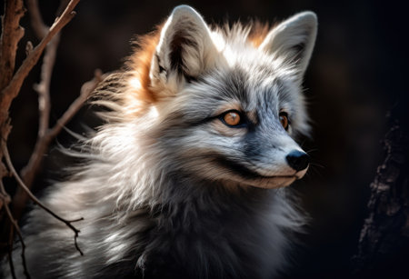 photograph gray fox illustration close up, face features, forest whiskers photograph gray fox