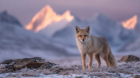 A fox with golden fur stands alert in a frosted, snowy field, with soft pink mountain peaks illuminated by the setting sun.